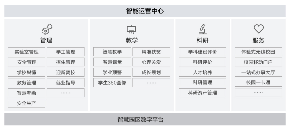 未來智能社會(huì)的人才需求與工業(yè)化教育體系之間的矛盾越來越突出,很多高校都面臨應(yīng)用碎片化、缺乏有效數(shù)據(jù)治理等挑戰(zhàn)。智能化校園解決方案運(yùn)用大數(shù)據(jù)、AI、視頻云、物聯(lián)網(wǎng)、GIS等新ICT技術(shù),實(shí)現(xiàn)教學(xué)、科研、管理、服務(wù)的資源共享,賦能科研創(chuàng)新,培育優(yōu)質(zhì)人才。
