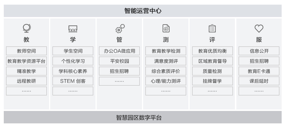 基礎(chǔ)教育是提高國民素質(zhì)和造就人才的基礎(chǔ)工程,從作坊式教育和工廠式教育逐步走向個(gè)性化教育發(fā)展中國的教育發(fā)展已經(jīng)發(fā)生了翻天覆地的變化。智能化校園解決方案以人為本,通過數(shù)字化技術(shù)實(shí)現(xiàn)從傳統(tǒng)教育向智慧教育轉(zhuǎn)變,從傳統(tǒng)校園向智慧校園轉(zhuǎn)變,圍繞教、學(xué)、管、測、評(píng)、服等六個(gè)方面,打造健康、安全、高效、創(chuàng)新的智慧校園;將各校園相關(guān)數(shù)據(jù)進(jìn)行采集、匯聚、分析、服務(wù),實(shí)現(xiàn)區(qū)域教育、教學(xué)優(yōu)質(zhì)資源的共享。