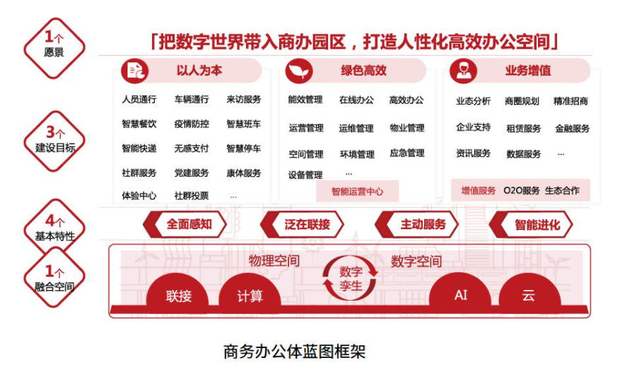 建設(shè)目標(biāo),則可以結(jié)合商辦特點(diǎn),把如何以人為本、綠色高效、業(yè)務(wù)增值在商辦園區(qū)展開(kāi)設(shè)計(jì);同樣,全面感知、泛在聯(lián)接、主動(dòng)服務(wù)和智能進(jìn)化 4個(gè)基本特征,1個(gè)融合空間等內(nèi)容,作為支撐的基礎(chǔ),可結(jié)合商辦園區(qū)的特點(diǎn),在技術(shù)實(shí)現(xiàn)層面加以詳細(xì)規(guī)劃。