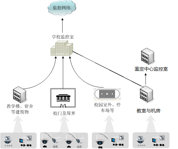(5)視頻監(jiān)控系統(tǒng)主要由前端攝像機(jī)組成,根據(jù)現(xiàn)場不同的環(huán)境和應(yīng)用選用不同的攝像機(jī),在出入口選擇紅外攝像機(jī),在樓梯口和走廊設(shè)置紅外槍式攝像機(jī)及寬動態(tài)紅外攝像機(jī),在周界可以選用紅外槍式攝像機(jī),在學(xué)院室外開闊區(qū)域選用室外球型攝像機(jī)等。