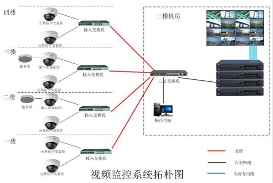 嚴(yán)格遵循綜合布線標(biāo)準(zhǔn),采用六類線、光纖結(jié)合的方式; 所有前端網(wǎng)絡(luò)攝像機(jī)通過(guò)六類網(wǎng)線全部連 接到各所屬區(qū)域的接入層交換機(jī),再通過(guò)光纖或網(wǎng)絡(luò)線連接到監(jiān)控中心的核心交換機(jī)。