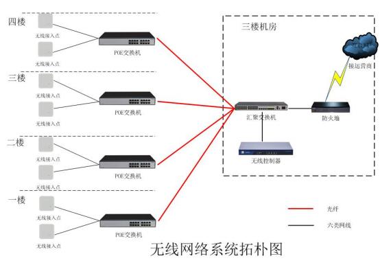 無(wú)線網(wǎng)絡(luò)采用無(wú)線接入點(diǎn)(AP) +無(wú)線控制器(AC) 的企業(yè)級(jí)無(wú)線網(wǎng)絡(luò)系統(tǒng)架構(gòu),星型拓?fù)浣Y(jié)構(gòu)。在