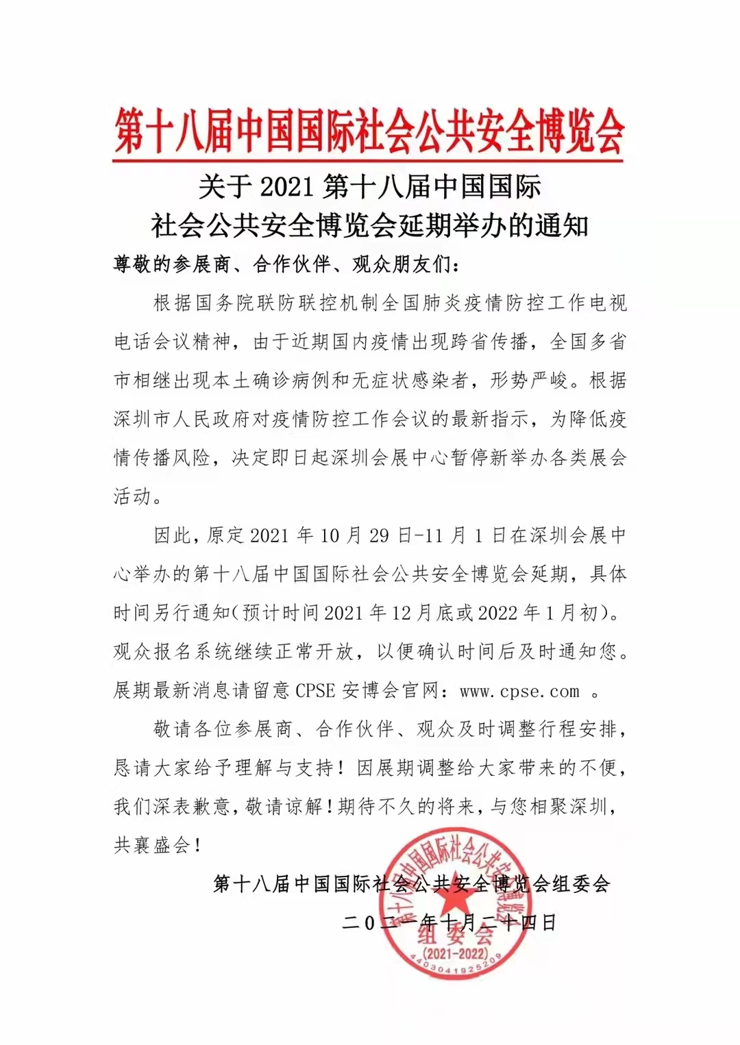 因此,原定 2021年10月29日-11月1日在深圳會展中心舉辦的第十八屆中國國際社會公共安全博覽會延期,具體時間另行通知(預(yù)計時間2021年12月底或2022年1月初)。