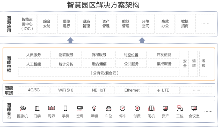 智慧園區(qū)解決方案依托華為產(chǎn)品組合,基于華為云,聯(lián)合生態(tài)伙伴,解決客戶(hù)問(wèn)題。以數(shù)字平臺(tái)打造智慧園區(qū)數(shù)字底座,實(shí)現(xiàn)南向連接標(biāo)準(zhǔn)化,北向應(yīng)用服務(wù)化。